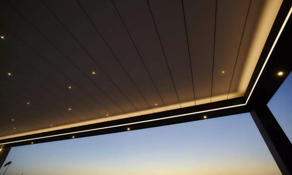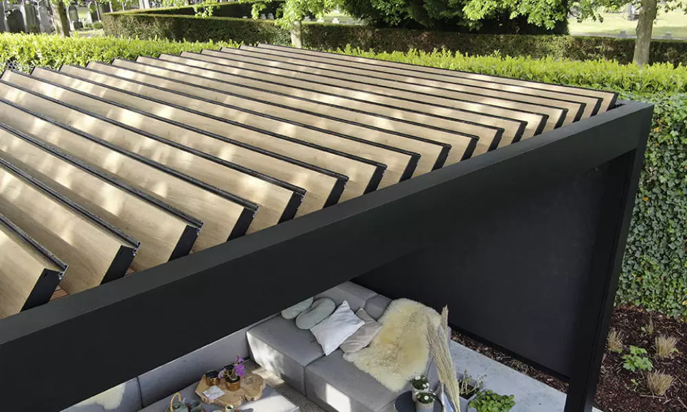 Le toit est équipé de lames orientables. En adaptant l’inclinaison des lames, vous contrôlez l’ombrage et la luminosité. En position fermée, les lames forment un toit parfaitement étanche.